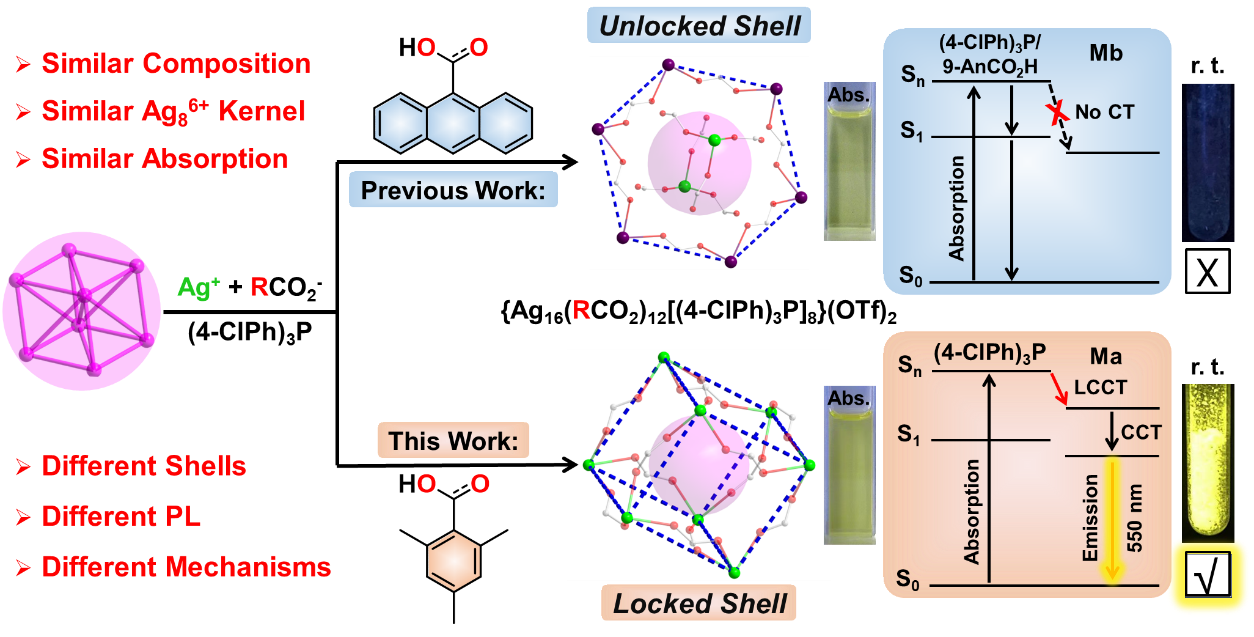 刘宽冠教授团队联合中国科学技术大学周蒙教授、清华大学王泉明教授在原子级精确金属纳米团簇的界面结构调控与光致发光性能研究方面取得重要进展。研究成果以“Room-temperature photoluminescence in monocarboxylate-protected silver nanoclusters via steric hindrance-induced interfacial structure locking”为题,正式被国际顶级期刊《Nature Communications》(影响因子15.7)接收发表,成人抖音